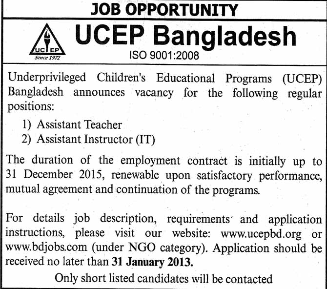 UCEP Bangladesh Jobs Circular, Source: Prothom Alo on 22.01.2013